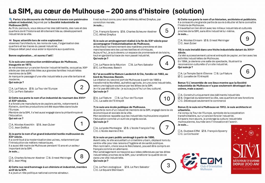 À l’occasion du bicentenaire de la Société Industrielle de Mulhouse (https://200.sim.asso.fr/), le Club d’Orientation de Mulhouse propose une édition spéciale de la Découverte Orientation Urbaine Mulhouse (DOUM), autour de l'histoire de la SIM.