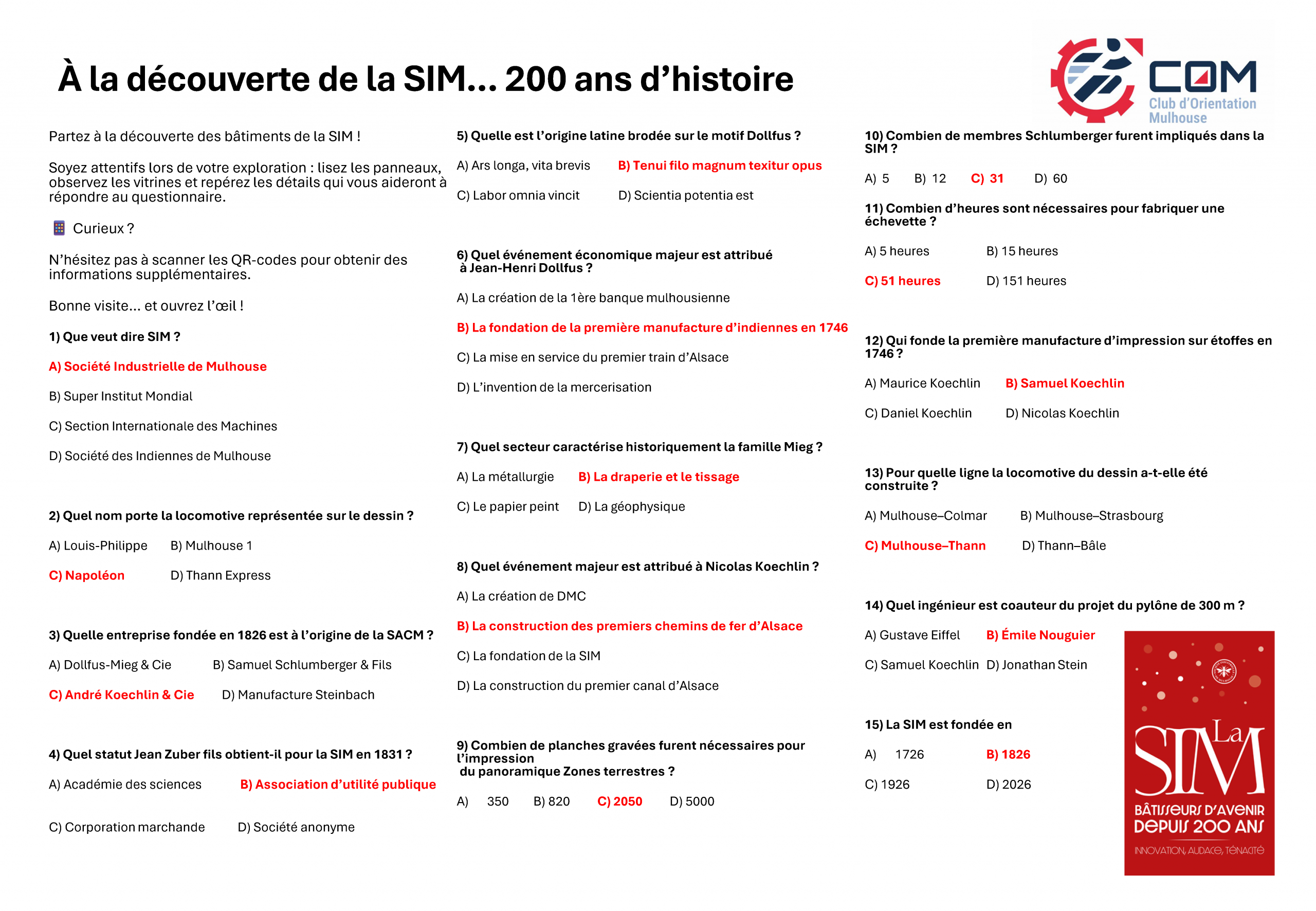 À l’occasion du bicentenaire de la Société Industrielle de Mulhouse (https://200.sim.asso.fr/), le Club d’Orientation de Mulhouse propose une édition spéciale indoor de la Découverte Orientation Urbaine Mulhouse (DOUM), au cœur même des bâtiments historiques de la SIM.
